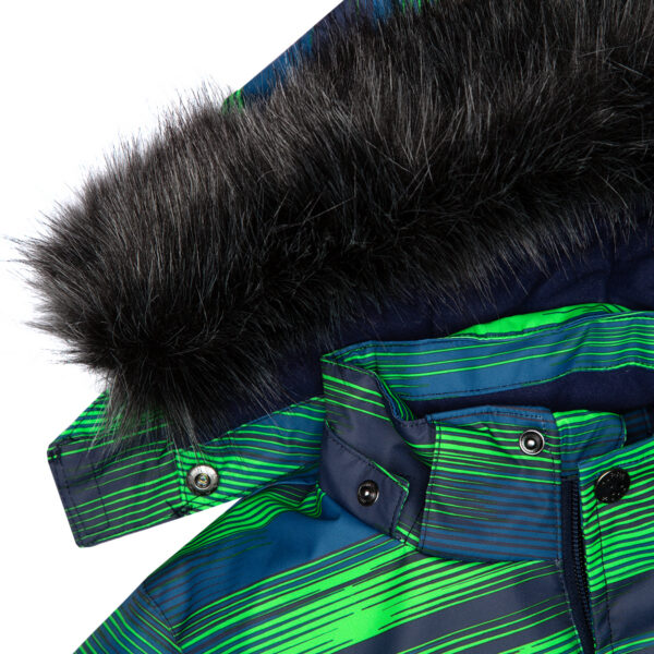 Children’s jacket and trousers set. Water- and windproof, breathable outer fabric. Inside of jacket and trousers in soft lining fabric. Elastic cuffs on ends of sleeves. Detachable hood fastens to the collar with snap buttons. Detachable faux fur trim on hood. Trousers have higher waist and adjustable elastic suspenders. Elastic waistband. Snow locks at leg ends. Rubber cord tunnel with stoppers at leg ends. Waterproof taped seams. Trousers have no inseam in leg part. Both jacket and trousers have reflective details.