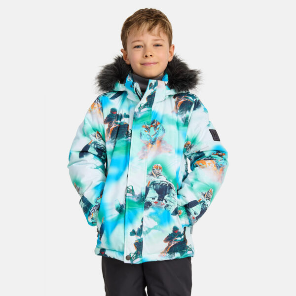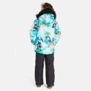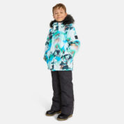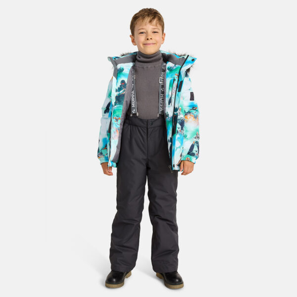 Children’s winter set with jacket and trousers. Water- and windproof, breathable outer fabric. Inside of jacket and trousers in soft lining fabric. The jacket has 300 g of insulation and the trousers have 160 g. Elastic cuffs on ends of sleeves. Detachable hood fastens to the collar with snap buttons. Detachable faux fur trim on hood. The trousers have detachable adjustable elastic suspenders. Elastic waistband. Snow locks at leg ends. Rubber cord tunnel with stoppers at leg ends. Waterproof taped seams. Both jacket and trousers have reflective details.