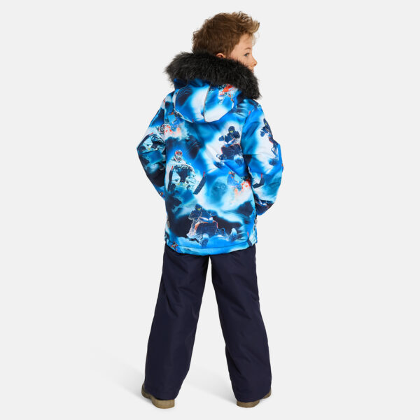 Children’s winter set with jacket and trousers. Water- and windproof, breathable outer fabric. Inside of jacket and trousers in soft lining fabric. The jacket has 300 g of insulation and the trousers have 160 g. Elastic cuffs on ends of sleeves. Detachable hood fastens to the collar with snap buttons. Detachable faux fur trim on hood. The trousers have a high waist and adjustable elastic suspenders. Elastic waistband. Snow locks at leg ends. Rubber cord tunnel with stoppers at leg ends. Waterproof taped seams. Trousers have no inseam in leg part. Both jacket and trousers have reflective details.