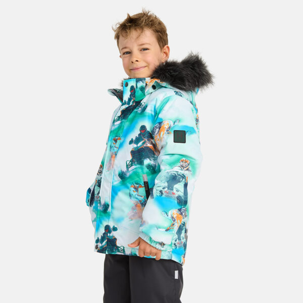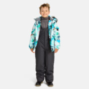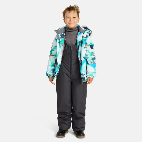 Children’s winter set with jacket and trousers. Water- and windproof, breathable outer fabric. Inside of jacket and trousers in soft lining fabric. The jacket has 300 g of insulation and the trousers have 160 g. Elastic cuffs on ends of sleeves. Detachable hood fastens to the collar with snap buttons. Detachable faux fur trim on hood. The trousers have a high waist and adjustable elastic suspenders. Elastic waistband. Snow locks at leg ends. Rubber cord tunnel with stoppers at leg ends. Waterproof taped seams. Trousers have no inseam in leg part. Both jacket and trousers have reflective details.