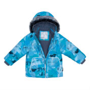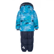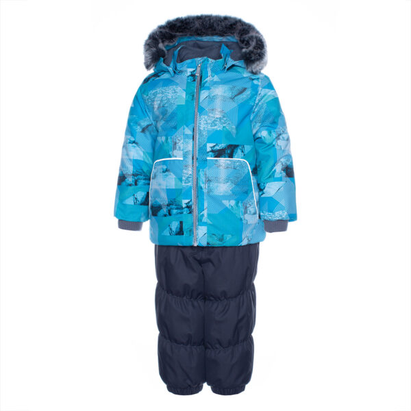 Boys´ winter set. The lining of the set is cotton flannel and the outer fabric is wind and waterproof. The jacket has 300g of insulation and the pants have 160g. Taped seams, elasticated bottoms on the pants and ribbed inner cuffs on the jacket sleeves keep the child warm and dry. The set has reflective details. The removable hood is attached to the collar with snaps.