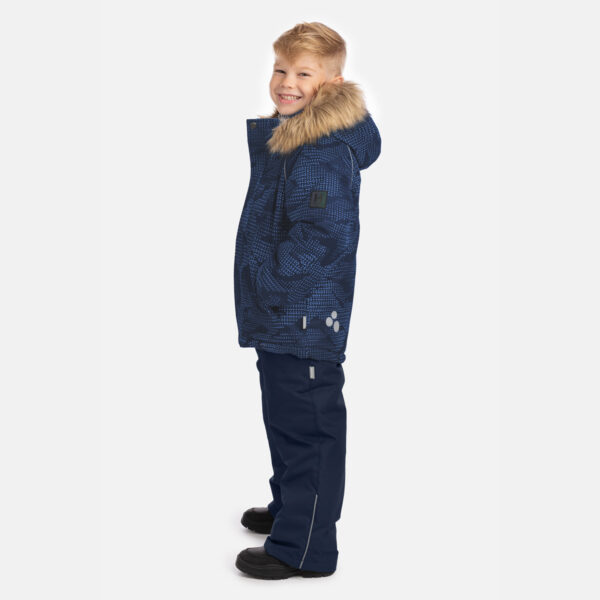 Children’s jacket and pants set. Waterproof, windproof and breathable fabric. Soft lining on the inside of the jacket and pants. Integrated elastic band at sleeve ends and on the waist. Removable snap-on hood. Faux fur trim on hood. The bib-pants have elastic adjustable suspenders. Integrated elastic band on waist. Drawstring tunnel with stoppers at leg ends. Waterproof taped seams. The pants have no inner leg seam. Reflective details on both jacket and pants.