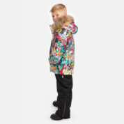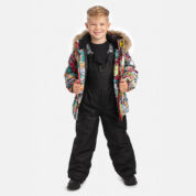 Children’s jacket and pants set. Waterproof, windproof and breathable fabric. Soft lining on the inside of the jacket and pants. Integrated elastic band at sleeve ends and on the waist. Removable snap-on hood. Faux fur trim on hood. The bib-pants have elastic adjustable suspenders. Integrated elastic band on waist. Drawstring tunnel with stoppers at leg ends. Waterproof taped seams. The pants have no inner leg seam. Reflective details on both jacket and pants.