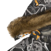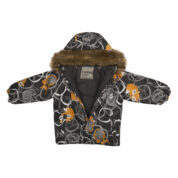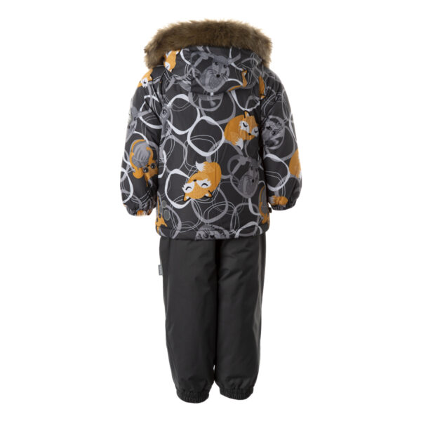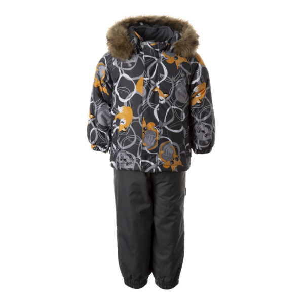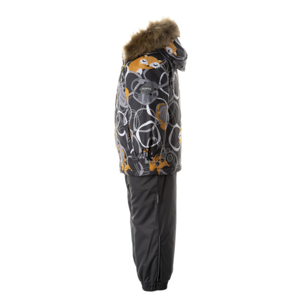 Children’s jacket and pants set. Waterproof and windproof, breathable top fabric. Soft mesh lining on the inside of the jacket and pants. Integrated elastic band at sleeve ends . Removable snap-on hood. Faux fur trim on hood. The bib pants have elastic adjustable braces. Integrated elastic band on waist. Waterproof taped seams. Reflective elements on both jacket and pants.