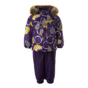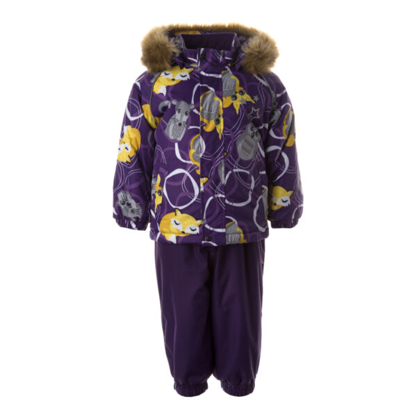 Children’s jacket and pants set. Waterproof and windproof, breathable top fabric. Soft mesh lining on the inside of the jacket and pants. Integrated elastic band at sleeve ends . Removable snap-on hood. Faux fur trim on hood. The bib pants have elastic adjustable braces. Integrated elastic band on waist. Waterproof taped seams. Reflective elements on both jacket and pants.