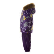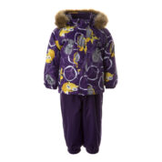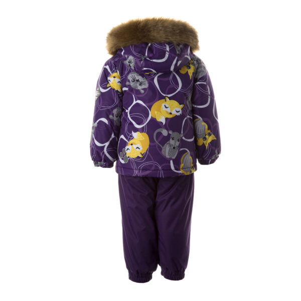 Children’s jacket and pants set. Waterproof and windproof, breathable top fabric. Soft mesh lining on the inside of the jacket and pants. Integrated elastic band at sleeve ends . Removable snap-on hood. Faux fur trim on hood. The bib pants have elastic adjustable braces. Integrated elastic band on waist. Waterproof taped seams. Reflective elements on both jacket and pants.