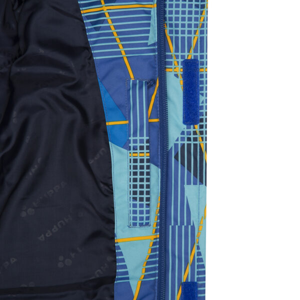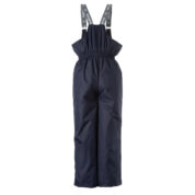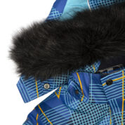 Children’s jacket and trousers set. Water- and windproof, breathable outer fabric. Inside of jacket and trousers in soft lining fabric. Elastic cuffs on ends of sleeves. Detachable hood fastens to the collar with snap buttons. Detachable faux fur trim on hood. Trousers have higher waist and adjustable elastic suspenders. Elastic waistband. Snow locks at leg ends. Rubber cord tunnel with stoppers at leg ends. Waterproof taped seams. Trousers have no inseam in leg part. Both jacket and trousers have reflective details.