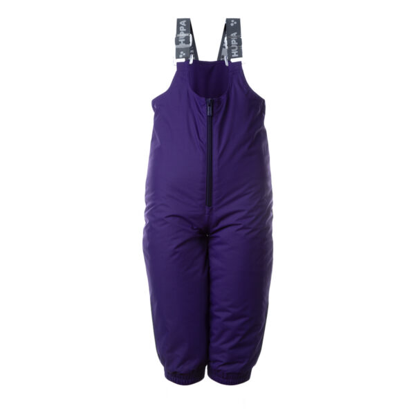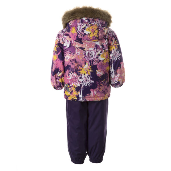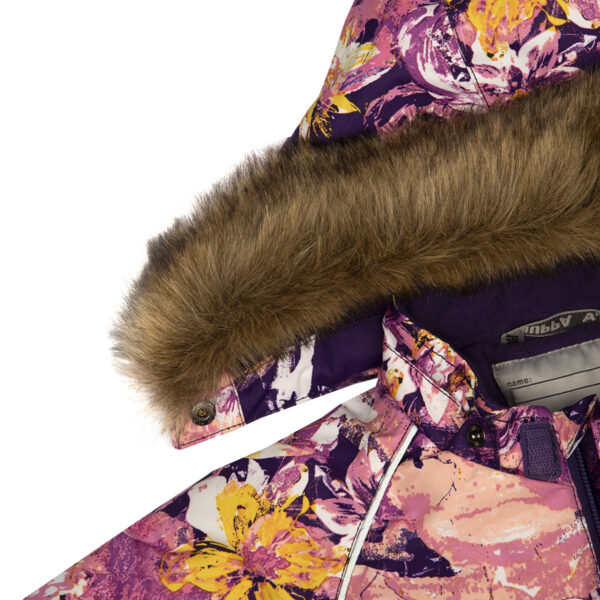 Children’s jacket and pants set. Waterproof and windproof, breathable top fabric. Soft mesh lining on the inside of the jacket and pants. Integrated elastic band at sleeve ends . Removable snap-on hood. Faux fur trim on hood. The bib pants have elastic adjustable braces. Integrated elastic band on waist. Waterproof taped seams. Reflective elements on both jacket and pants.
