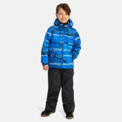 Bērnu starpsezonas jakas un bikšu komplekts. Ūdens- un vēja izturīgs, elpojošs virsaudums. Jakas un bikšu iekšpusē ir mīksts oderaudums. Piedurkņu galos un kapuces malā iestrādāta gumijas lente. Noņemamā kapuce pie apkakles nostiprināma ar spiedpogām. Biksēm ir augstāka jostasvieta un regulējamas, elastīgas lences. Jostasvietā iestrādāta gumijas lente. Staru galos gumijas auklas tunelis ar iestrādātām atdurēm. Ūdensnoturīga, stepēta sēžas šuve. Biksēm nav staras iekšējās šuves. Gan jakai, gan biksēm ir atstarojošas detaļas.