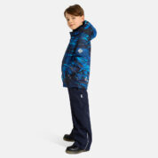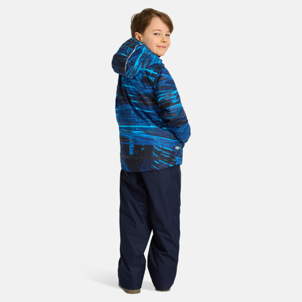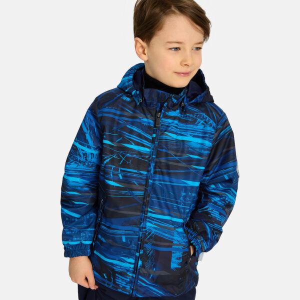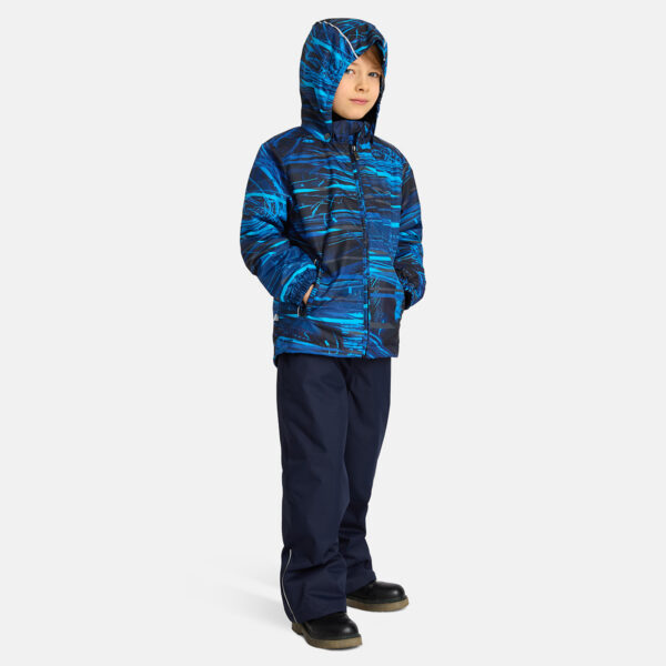 Children´s transition season jacket and pants set. Water- and windproof, breathable outer fabric. The inside of the jacket and trousers is made of soft lining fabric. Rubber band incorporated in the sleeve ends and the edge of the hood. The removable hood attaches to the collar with press studs. The trousers have a higher waist and adjustable elastic braces. incorporated rubber waistband. Rubber band tunnel with stoppers at the ends of the legs. Waterproof taped seat seam. The pants have no inseam on the leg. Both jackets and trousers have reflective details.