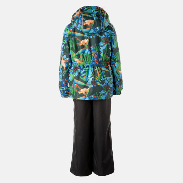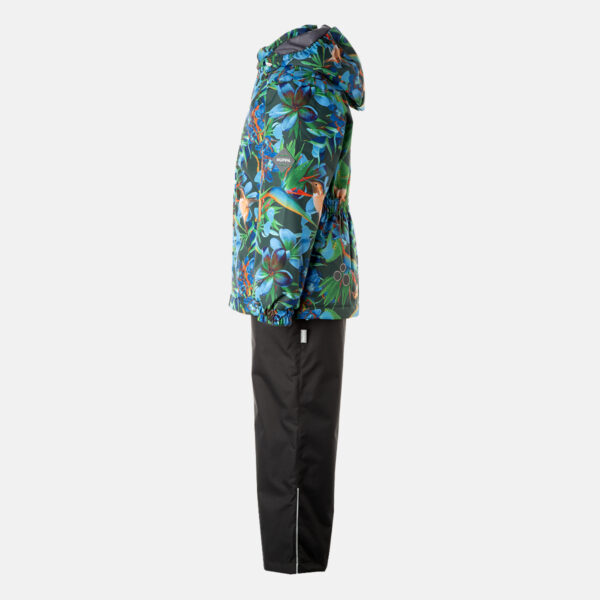Bērnu starpsezonas jakas un bikšu komplekts. Ūdens- un vēja izturīgs, elpojošs virsaudums. Jakas un bikšu iekšpusē ir mīksts oderaudums. Piedurkņu galos, kapuces malā un mugurpusē iestrādāta gumijas lente. Noņemamā kapuce pie apkakles nostiprināma ar spiedpogām. Biksēm ir augstāka jostasvieta un regulējamas, elastīgas lences. Jostasvietā iestrādāta gumijas lente. Staru galos gumijas auklas tunelis ar iestrādātām atdurēm. Ūdensnoturīga, stepēta sēžas šuve. Biksēm nav staras iekšējās šuves. Gan jakai, gan biksēm ir atstarojošas detaļas.