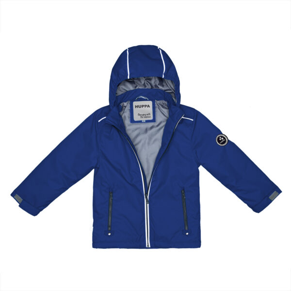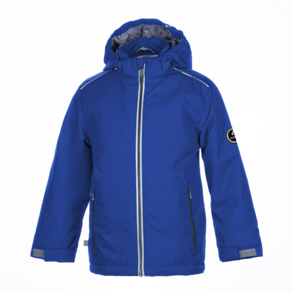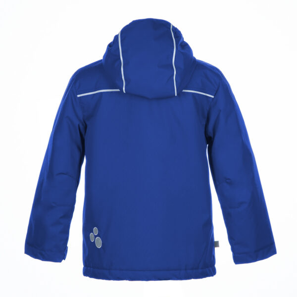 Insulated (100 g) water- and windproof between-seasons jacket for kids. The outer fabric is breathable. There is a sewn-in elastic band in the hood. Adjustable sleeves. The detachable hood can be attached to the collar with snap-buttons. The outer fabric is decorated with reflective details.