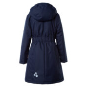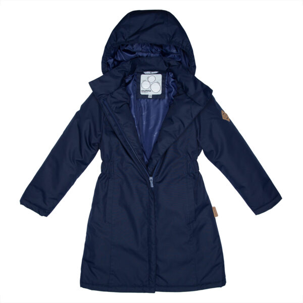 Water- and windproof spring-autumn coat for girls. Breathable outer fabric. The inside of the coat is made of soft lining fabric. Rubber band incorporated on the edge of the hood and on the back at the waistline. Zipper fastener. Incorporated front pockets. The coat has waterproof taped shoulder seams. Reflective details on the outer fabric.