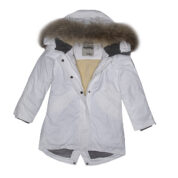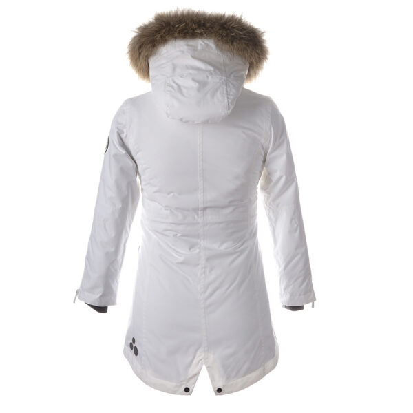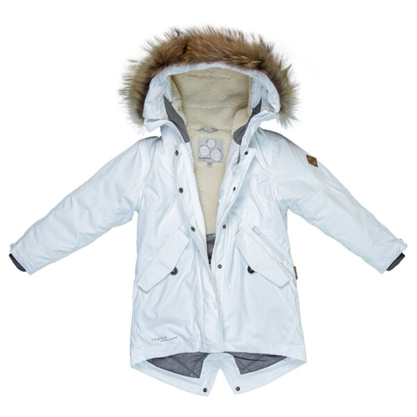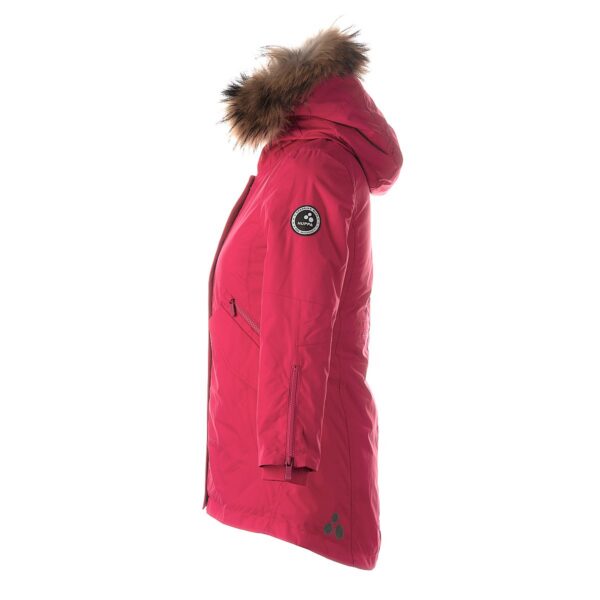 Women’s waterproof and windproof winter parka. Breathable fabric. Soft fabric on the inside. Faux sheepskin lining at the top of the back and inside the hood. Adjustable hood. Ribbed cuffs at sleeve ends. Two-way zipper covered with stud-press flap at front. Magnetic fastening on flap pockets. Drawstring tunnel with stoppers on waist. Waterproof taped seams. Removable natural fur trim on hood. Reflective elements on fabric.