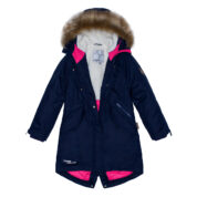 Children’s waterproof and windproof winter parka. Breathable fabric. Soft fabric on the inside. Faux sheepskin lining at the top of the back and inside the hood. Adjustable hood. Ribbed cuffs at sleeve ends. Two-way zipper covered with stud-press flap at front. Magnetic fastening on flap pockets. Drawstring tunnel with stoppers on waist. Waterproof taped seams. Removable faux fur trim on hood. Reflective elements on fabric.