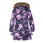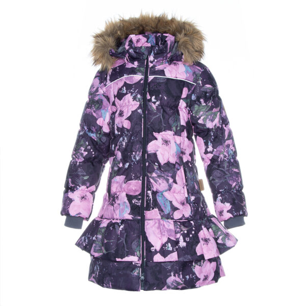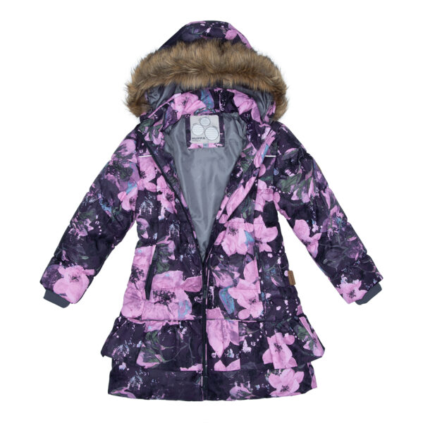 Girls´ 300g insulated winter coat. The outer fabric is breathable and weatherproof. Soft taffeta lining inside. Ribbed inner cuffs on the sleeves. Coat has reflective details. The removable hood fastened with snaps and its fur edge is also removable. The coat is equipped with zippered front pockets.