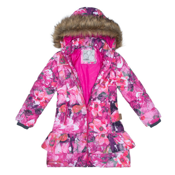 Girls´ 300g insulated winter coat. The outer fabric is breathable and weatherproof. Soft taffeta lining inside. Ribbed inner cuffs on the sleeves. Coat has reflective details. The removable hood fastened with snaps and its fur edge is also removable. The coat is equipped with zippered front pockets.