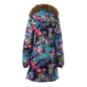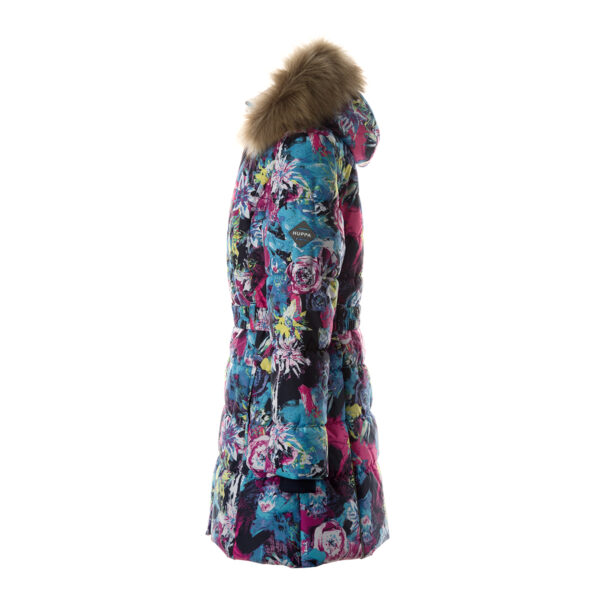 Children’s waterproof and windproof winter coat Breathable fabric Soft lining on the inside Removable snap-on hood Ribbed cuffs at sleeve ends Two-way zipper at front Faux fur trim on hood Reflective elements on fabric