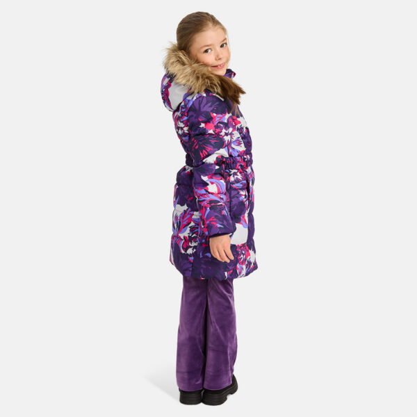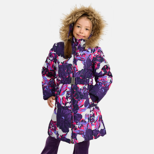 Children’s waterproof and windproof winter coat Breathable fabric Soft lining on the inside Removable snap-on hood Ribbed cuffs at sleeve ends Two-way zipper at front Faux fur trim on hood Reflective elements on fabric
