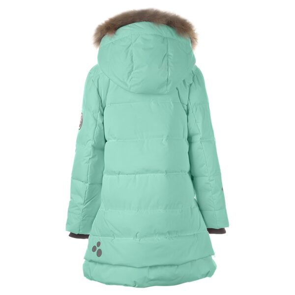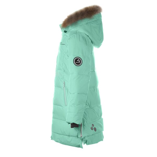Children’s waterproof and windproof down coat. Breathable fabric. Soft lining on the inside. Down feathers and feathers for filling. Removable snap-on hood. Ribbed cuffs at sleeve ends. With zipper. Integrated zipper pockets at front. Zippered side slits at lower edge. Removable natural fur trim on hood. Reflective elements on fabric.