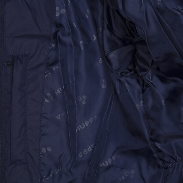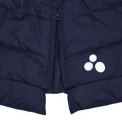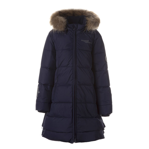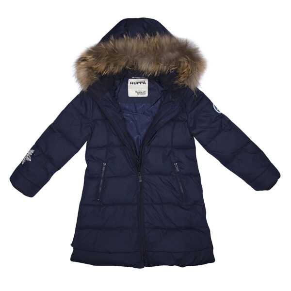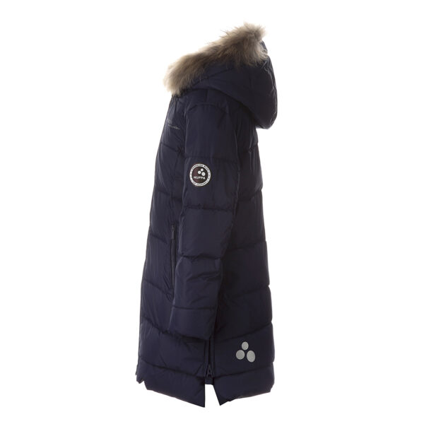 Children’s waterproof and windproof down coat. Breathable fabric. Soft lining on the inside. Down feathers and feathers for filling. Removable snap-on hood. Ribbed cuffs at sleeve ends. With zipper. Integrated zipper pockets at front. Zippered side slits at lower edge. Removable natural fur trim on hood. Reflective elements on fabric.