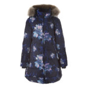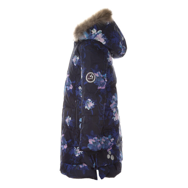 Children’s waterproof and windproof down coat. Breathable fabric. Soft lining on the inside. Down feathers and feathers for filling. Removable snap-on hood. Ribbed cuffs at sleeve ends. With zipper. Integrated zipper pockets at front. Zippered side slits at lower edge. Removable natural fur trim on hood. Reflective elements on fabric.
