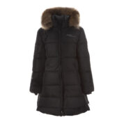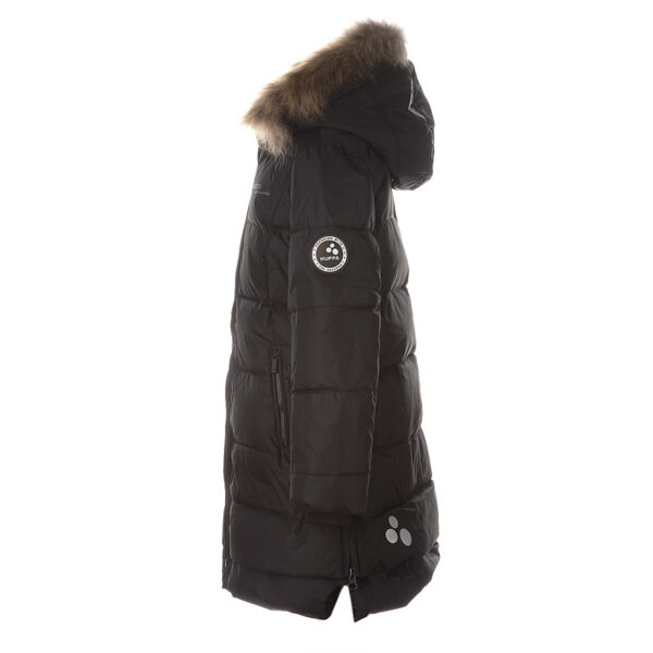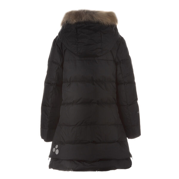 Children’s waterproof and windproof down coat. Breathable fabric. Soft lining on the inside. Down feathers and feathers for filling. Removable snap-on hood. Ribbed cuffs at sleeve ends. With zipper. Integrated zipper pockets at front. Zippered side slits at lower edge. Removable natural fur trim on hood. Reflective elements on fabric.