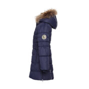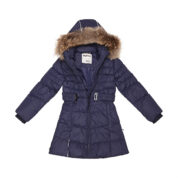 Girls´ down coat made of soft fabric for the coldest weather. The coat has a comfortable taffeta lining and a breathable and waterproof outer fabric. The coat has a removable hood with a separate removable fur. Ribbed cuffs. The coat has a belt with a buckle. Reflective details on the hood and in the seams of the coat´s hem help. The coat has a zippered inner pocket and two outer pockets.