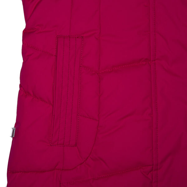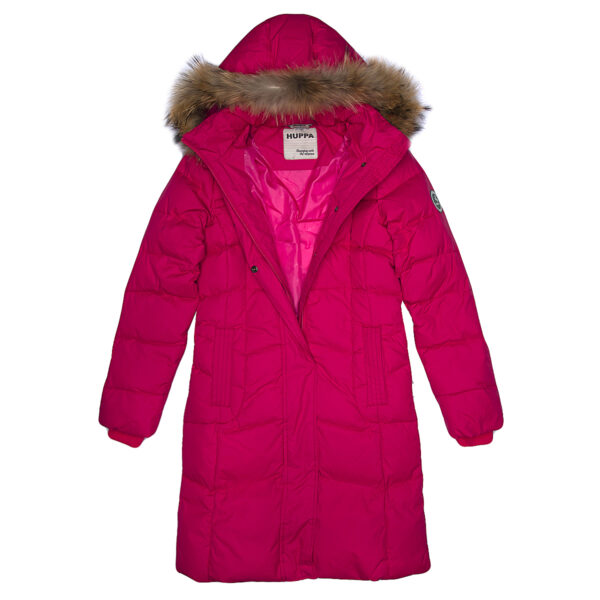 Stylish waterproof and windproof girls´ down coat. Breathable fabric. Soft lining on the inside. Down feathers and feathers for filling. Removable snap-on hood. Ribbed cuffs at sleeve ends. Two-way zipper covered with stud-press flap at front. Removable natural fur trim on hood. Reflective elements on the top fabric to add visibility in the dark.