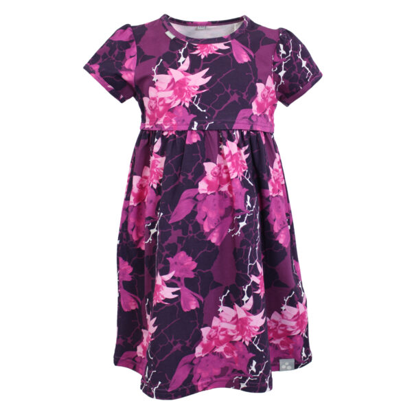 Girls´ dress with short sleeves. Material is 95% cotton, 5% elastane. Available in sizes 92-140.