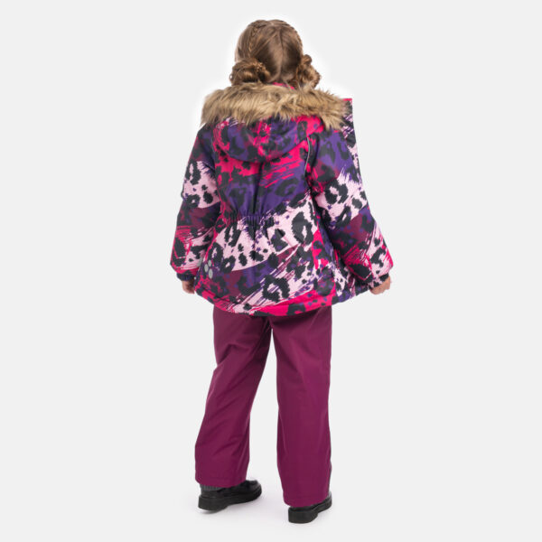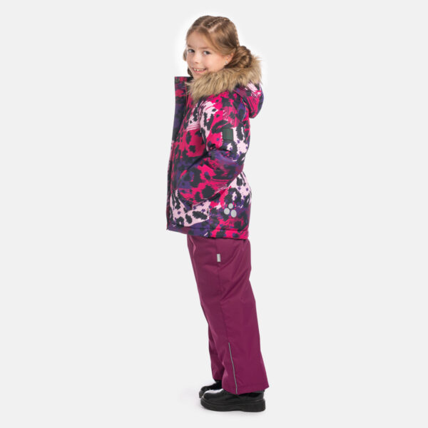 Girls’ 300g insulated winter jacket. The jacket has a soft flannel lining, and the outer fabric is both windproof and waterproof. Ribbed inner cuffs in the sleeves keep the child warm and dry even during active play. Reflective details added to the jacket ensure safety in the dark. The detachable hood with faux fur is safe for outdoor play, as it is attached with snap buttons to prevent snagging.