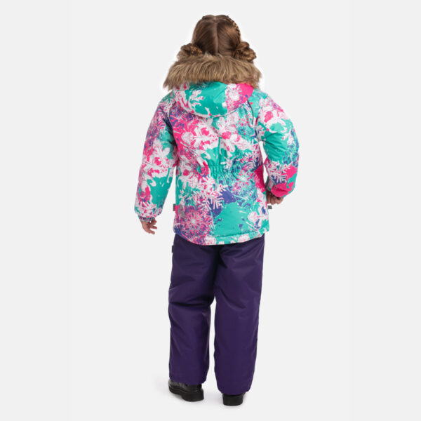 Girls’ 300g insulated winter jacket. The jacket has a soft flannel lining, and the outer fabric is both windproof and waterproof. Ribbed inner cuffs in the sleeves keep the child warm and dry even during active play. Reflective details added to the jacket ensure safety in the dark. The detachable hood with faux fur is safe for outdoor play, as it is attached with snap buttons to prevent snagging.