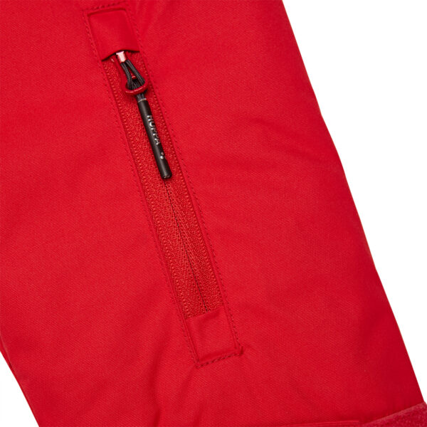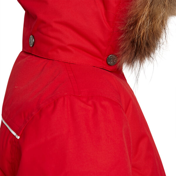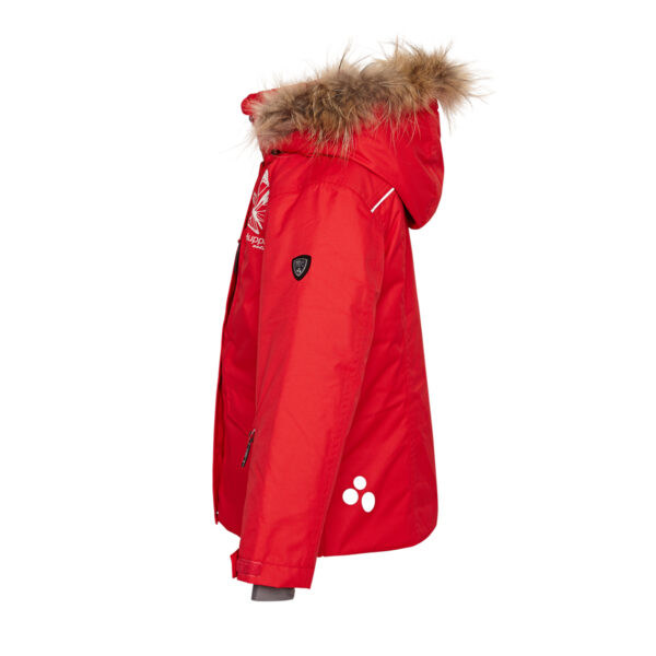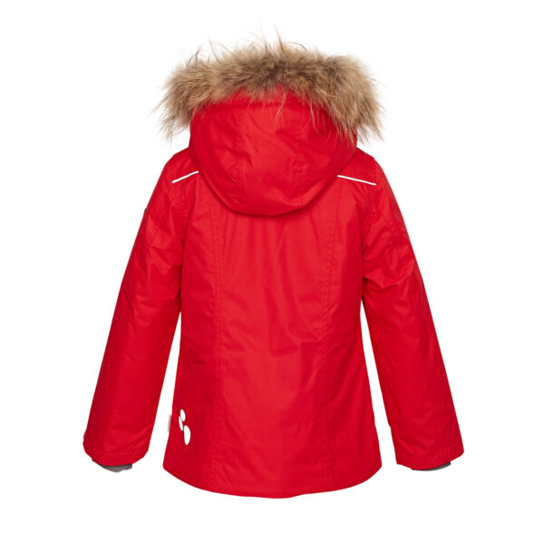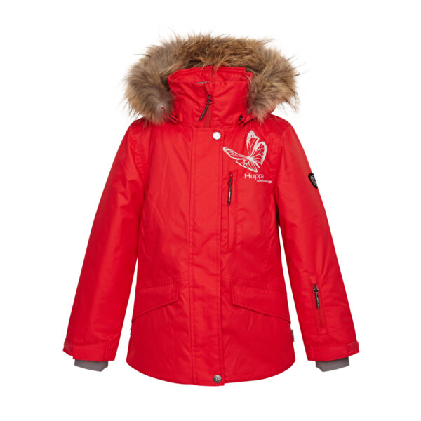 Girls´ winter jacket. The wind and water resistant outer fabric of the jacket has the best technical characteristics and the insulation is 200g. The ribbed inner cuffs in the jacket sleeves and the snow guard keep you warm and dry even when doing sports. The jacket is lined with heat-reflecting HUPPATEC fabric.
