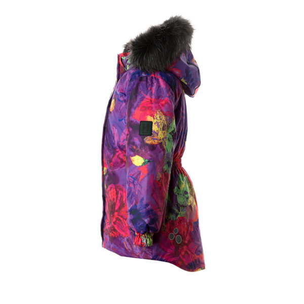 Children’s waterproof and windproof jacket. Breathable fabric. Soft mesh lining on the inside. Removable snap-on hood. Integrated elastic band at sleeve ends and on the waist. Zipper fastening Integrated zipper pockets at front. Removable faux fur trim on hood. Reflective elements on fabric.