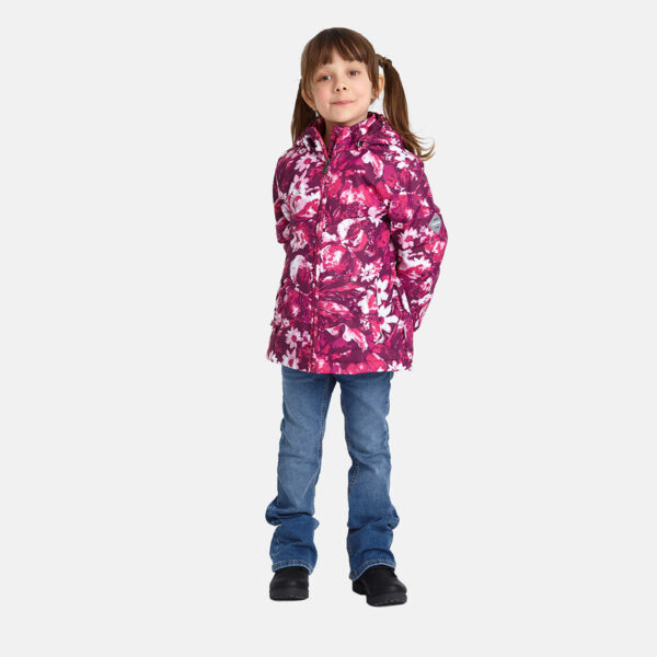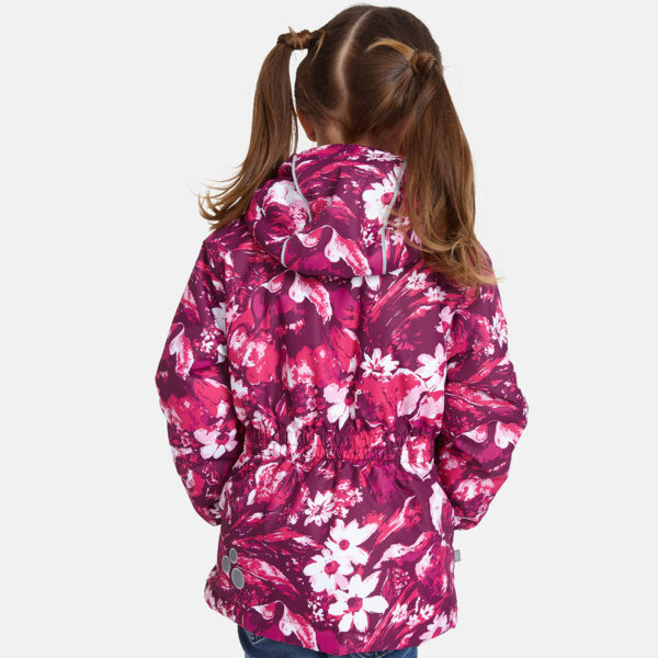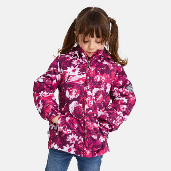 Children´s waterproof and windproof jacket. Breathable outer fabric. Rubber band incorporated in the sleeve ends, hood edge, and back waist. The removable hood attaches to the collar with press studs. Reflective details on the front and back.