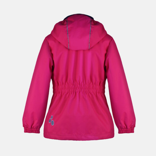 Children´s waterproof and windproof jacket. Breathable outer fabric. Rubber band incorporated in the sleeve ends, hood edge, and back waist. The removable hood attaches to the collar with press studs. Reflective details on the front and back.