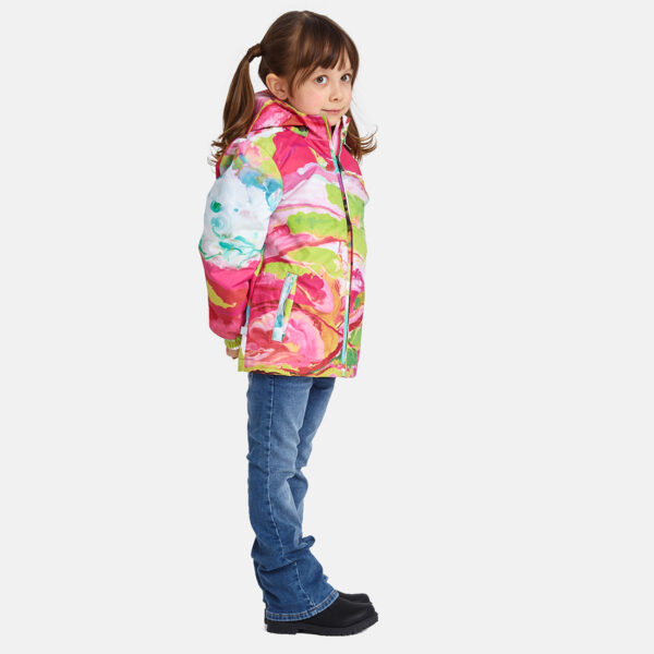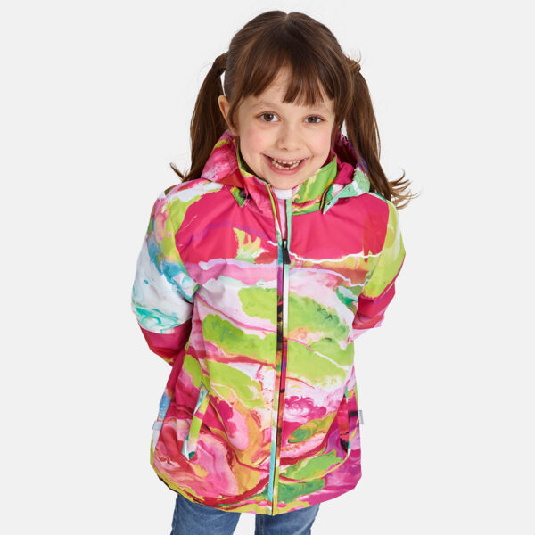 Children´s waterproof and windproof jacket. Breathable outer fabric. Rubber band incorporated in the sleeve ends, hood edge, and back waist. The removable hood attaches to the collar with press studs. Reflective details on the front and back.