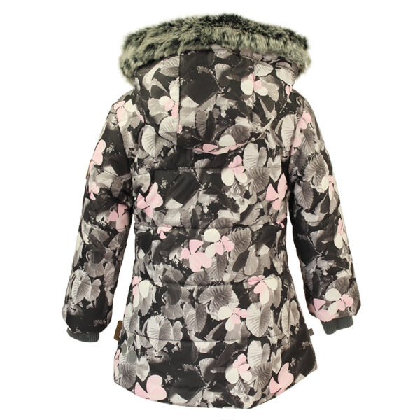 Little girls´ winter jacket with 300g insulation. The lining of the jacket is soft cotton flannel and the outer fabric is wind and water resistant. The inner ribbed cuffs on the sleeves of the jacket keep the child warm and dry. To ensure the child is visible even in the dark, the jacket has been equipped with reflective details and the front of the chest is decorated with a reflective detail. The removable hood is safe for playing outside – it is fastened with snaps to prevent getting caught, and its fur edge is also removable.