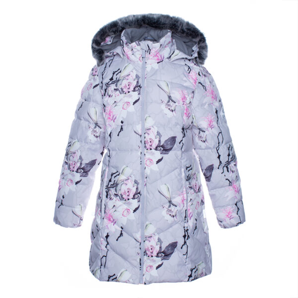 Children’s waterproof and windproof quilted winter coat. Breathable fabric. Soft lining on the inside. Removable snap-on hood. The coat is filled with innovative recycled material imitating the properties of feather fill. The material is warm, dries quickly and does not clump after washing. A great to natural feather fill. Removable faux fur trim on hood. Two zippered pockets at front for gloves or other necessities. Reflective elements on fabric.