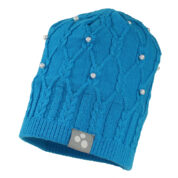 Thin knitted hat for girls is decorated with rhinestones. It is made of 50% merino wool, 50% acrylic and has a lining of 100% cotton jersey.