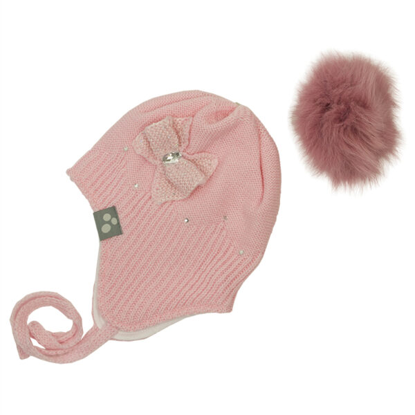 Girls´ winter hat with a tie. The lining of the hat is made of cotton jersey and the outer layer is 100% acrylic. The decoration is a removable tassel on the top and rhinestones.