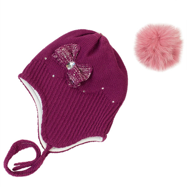 Girls´ winter hat with a tie. The lining of the hat is made of cotton jersey and the outer layer is 100% acrylic. The decoration is a removable tassel on the top and rhinestones.