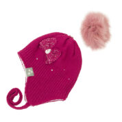 Girls´ winter hat with a tie. The lining of the hat is made of cotton jersey and the outer layer is 100% acrylic. The decoration is a removable tassel on the top and rhinestones.