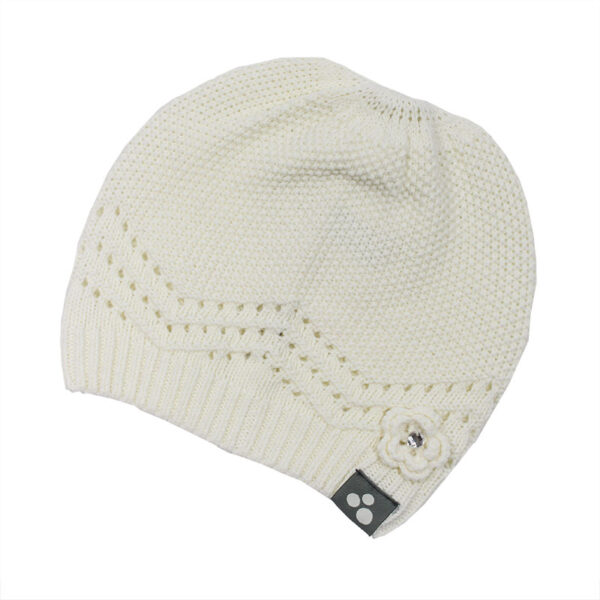 Girls´ thinner knitted spring-autumn hat. The hat with a cute pattern is knitted from a of 60% cotton, 40% acrylic yarn blend. The hat is decorated with a little star with a stone. The bottom edge of the hat is knitted in rib.