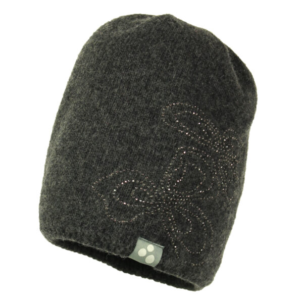 A warm and soft hat decorated with shiny stones. The hat is double knitted and the yarn composition is 80% wool and 20% nylon.