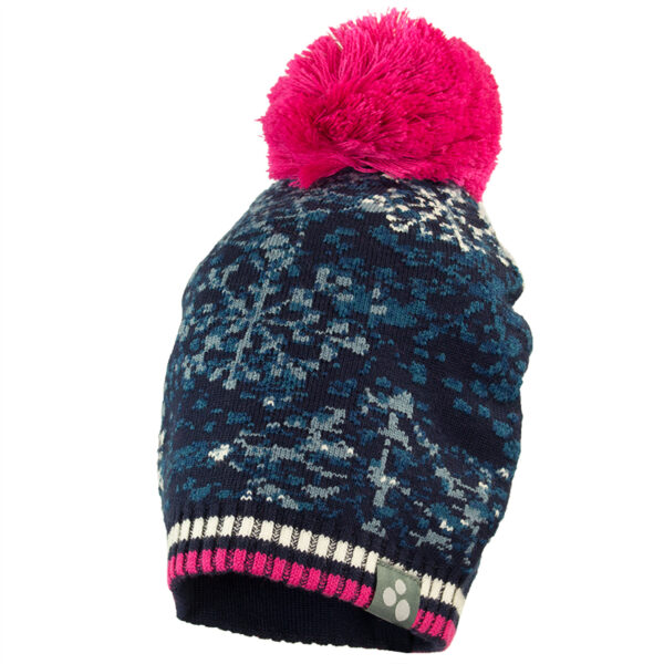Girls´ knitted tassel hat. The hat is double-knitted from 50% merino wool, 50% acrylic. The nice ribbed hem protects the ears from the cold wind.