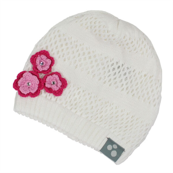 Knitted spring-autumn hat for girls. The lace hat is knitted from two layers of soft 100% cotton yarn. The hat is decorated with pretty crocheted flowers on one side and a modest Huppa logo. For more comfortable wearing, the bottom edge of the hat is knitted in a ribbed pattern so that the hat stays on the head better.