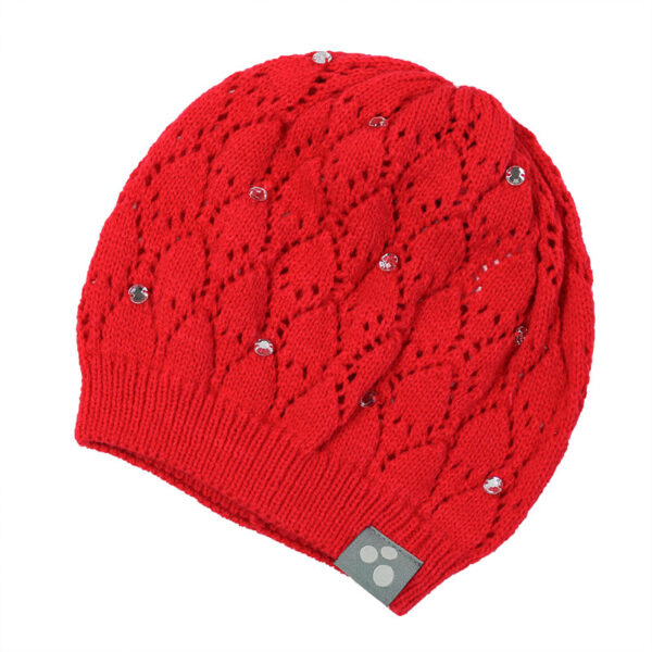 Girls´ knitted spring-autumn hat. The hat is knitted from soft 100% acrylic yarn. The hat is decorated with lots of shiny stones. For more comfortable wearing, the bottom is knitted in a ribbed pattern.
