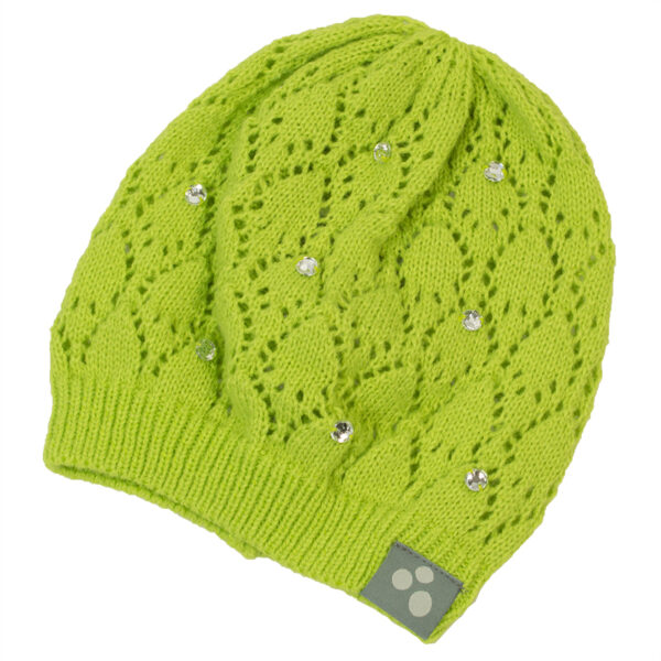 Girls´ knitted spring-autumn hat. The hat is knitted from soft 100% acrylic yarn. The hat is decorated with lots of shiny stones. For more comfortable wearing, the bottom is knitted in a ribbed pattern.