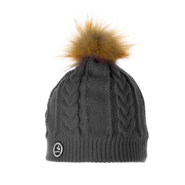 Children´s hat with fleece lining, knitted from soft yarn. Faux fur pompom. Reflective Huppa logo on the hat.